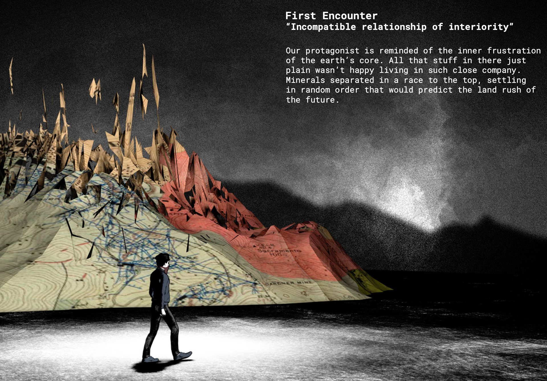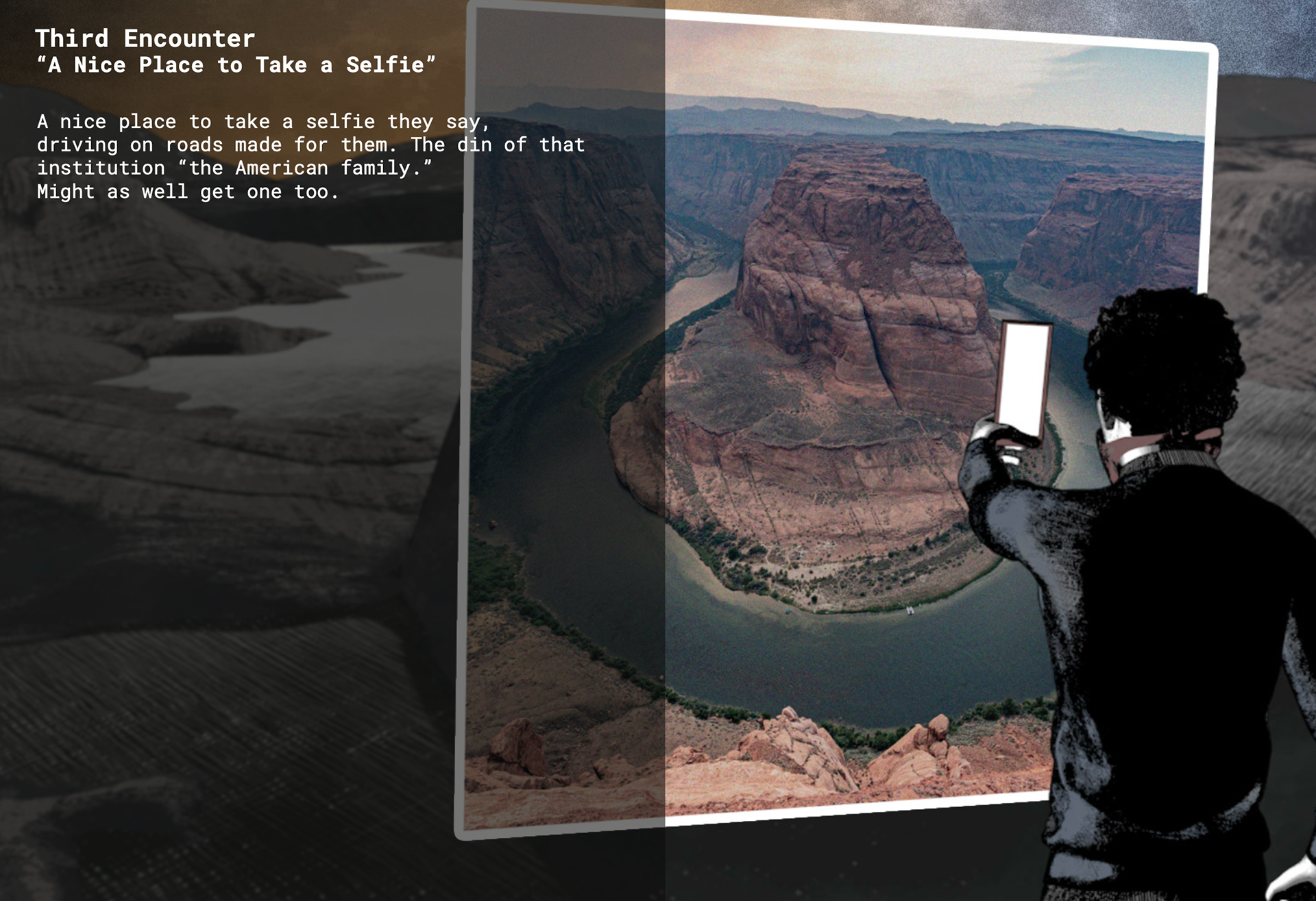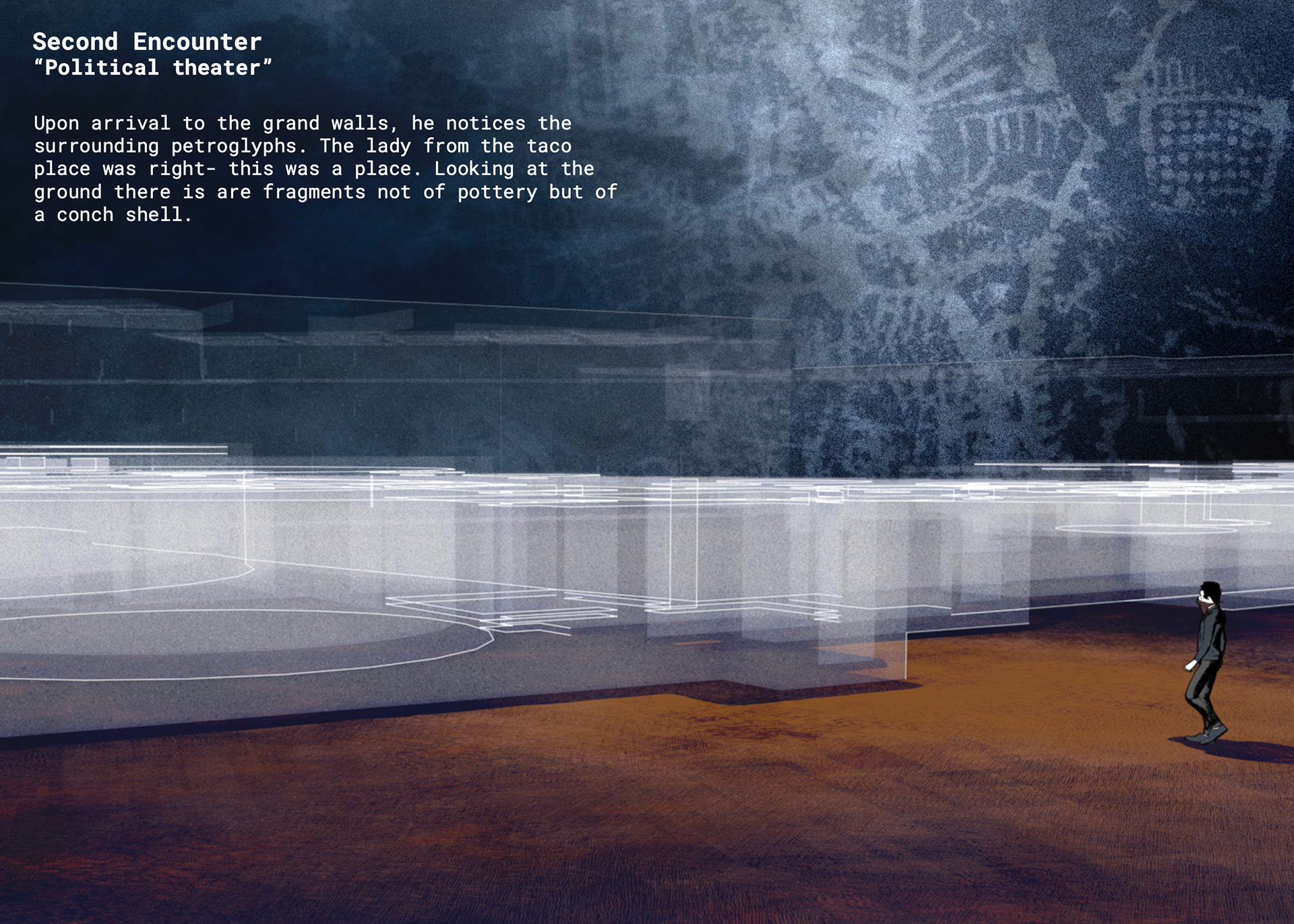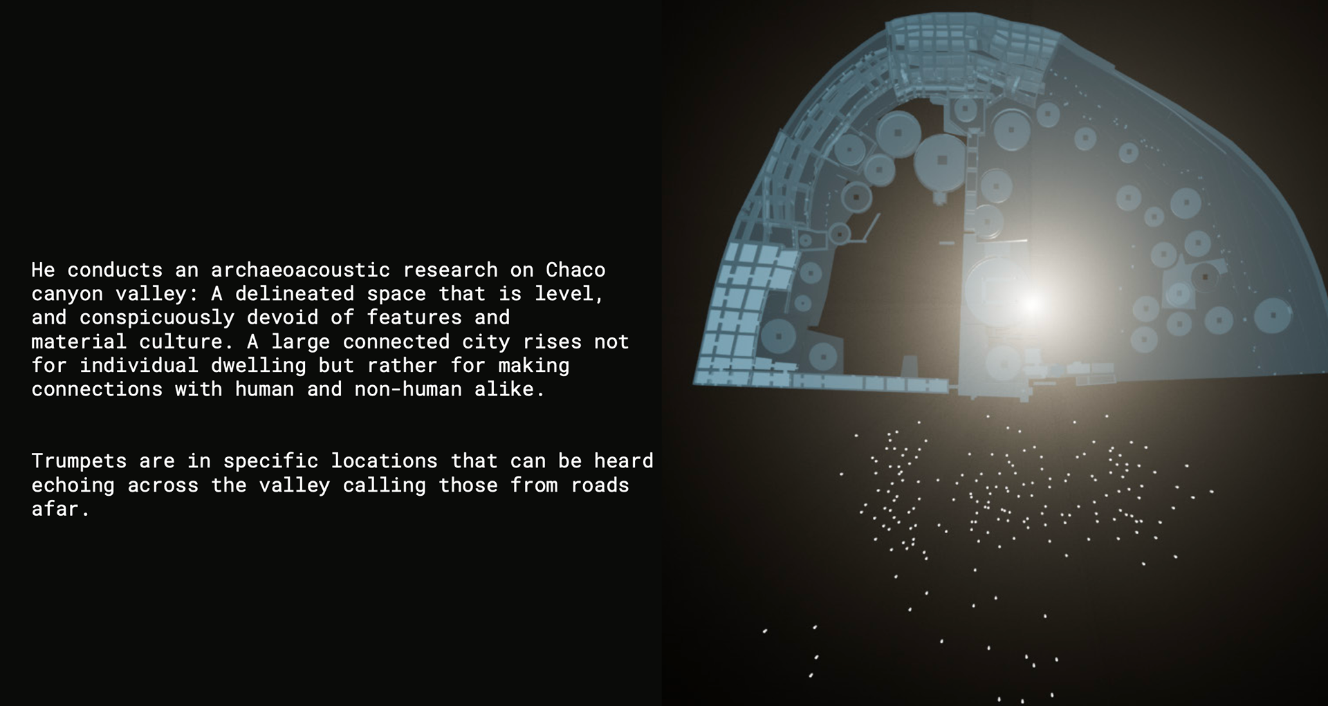 What began as two and a half months of remote, off-grid documentation across the Southwest — collecting footage and field recordings — evolved into a rejection of straightforward documentary in favor of procedural animation and projection mapping, with "Crowboy" emerging as a shadowy collaborator to destabilize the author's own perspective. The result is a world that invites curiosity without resolving it.